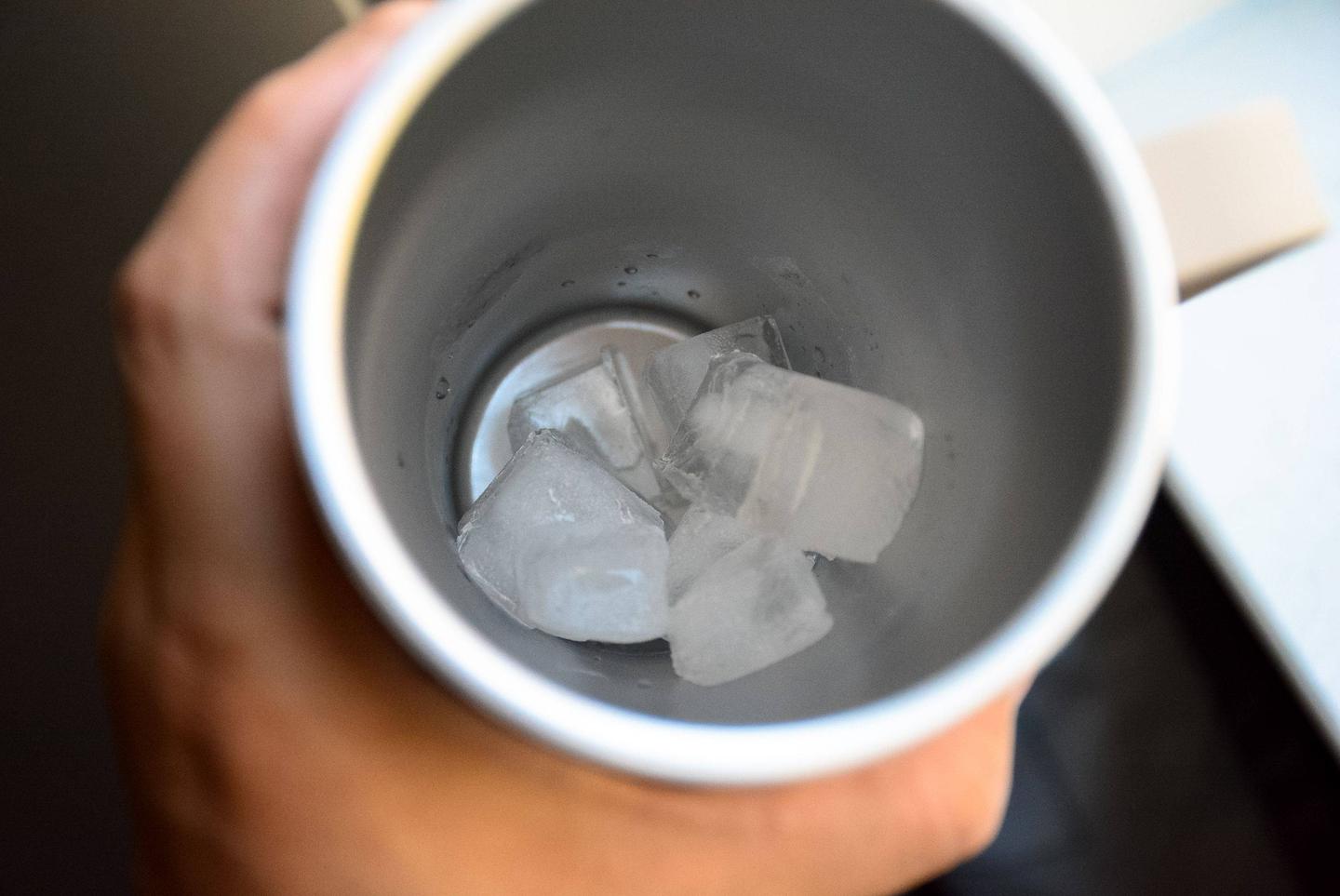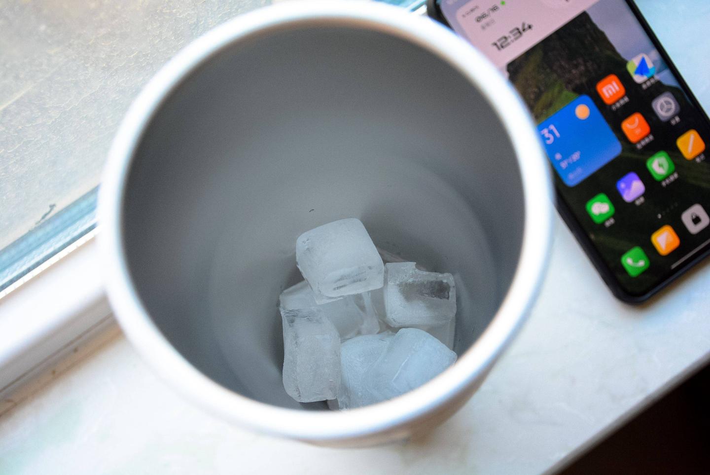The time was 10:34, I put some ice cubes into the cool leather thermos cup, then closed the lid and waited for the time to pass minute by minute. The thermos cup is placed at home without direct light; The temperature at home is about 26°C, and it has rained continuously in the past few days, and the weather is not hot.