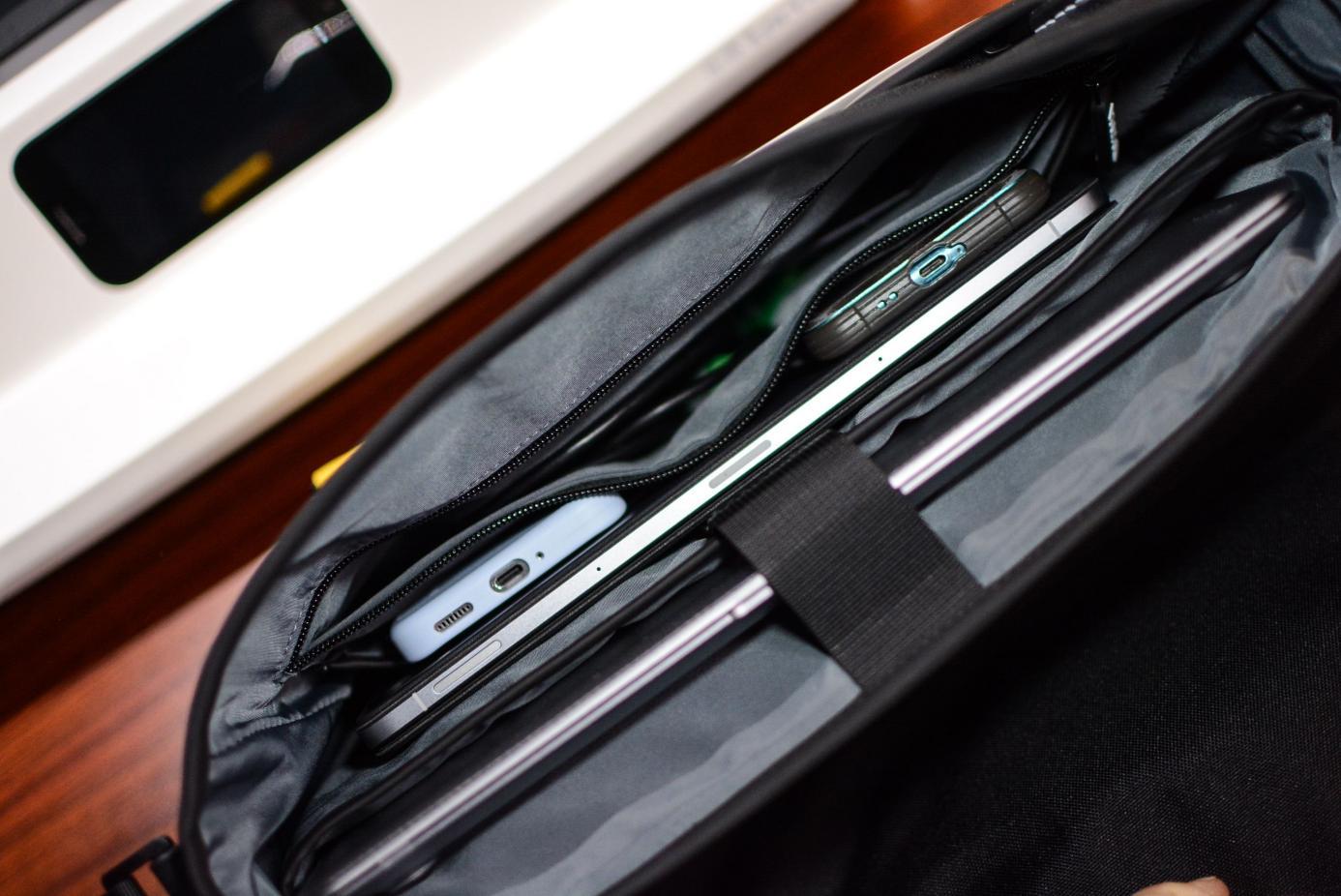 When actually used, you can see that you can easily put in two mobile phones + a laptop + a tablet, and the space in the bag is more than enough; I also put data cables in the zippered compartment, which are metal items that are easy to scratch the phone, and the design is very reasonable.