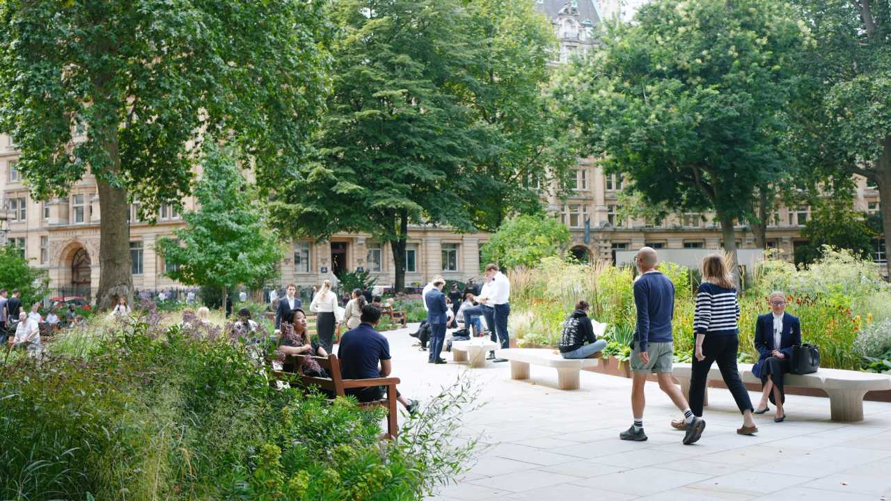 Delicate pocket parks—lunchtime filled with people eating and chatting.