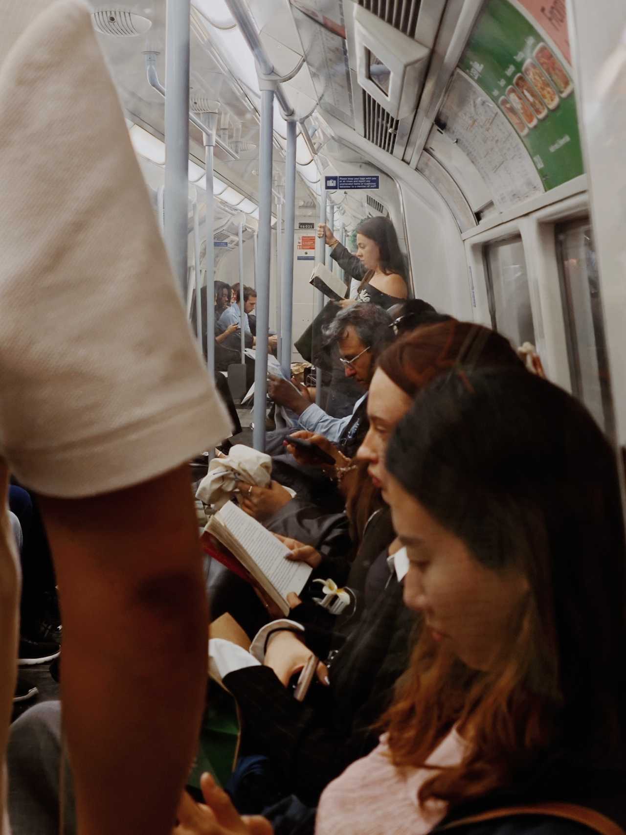 Underground, mobile signal is basically gone—many people bring books to commute.