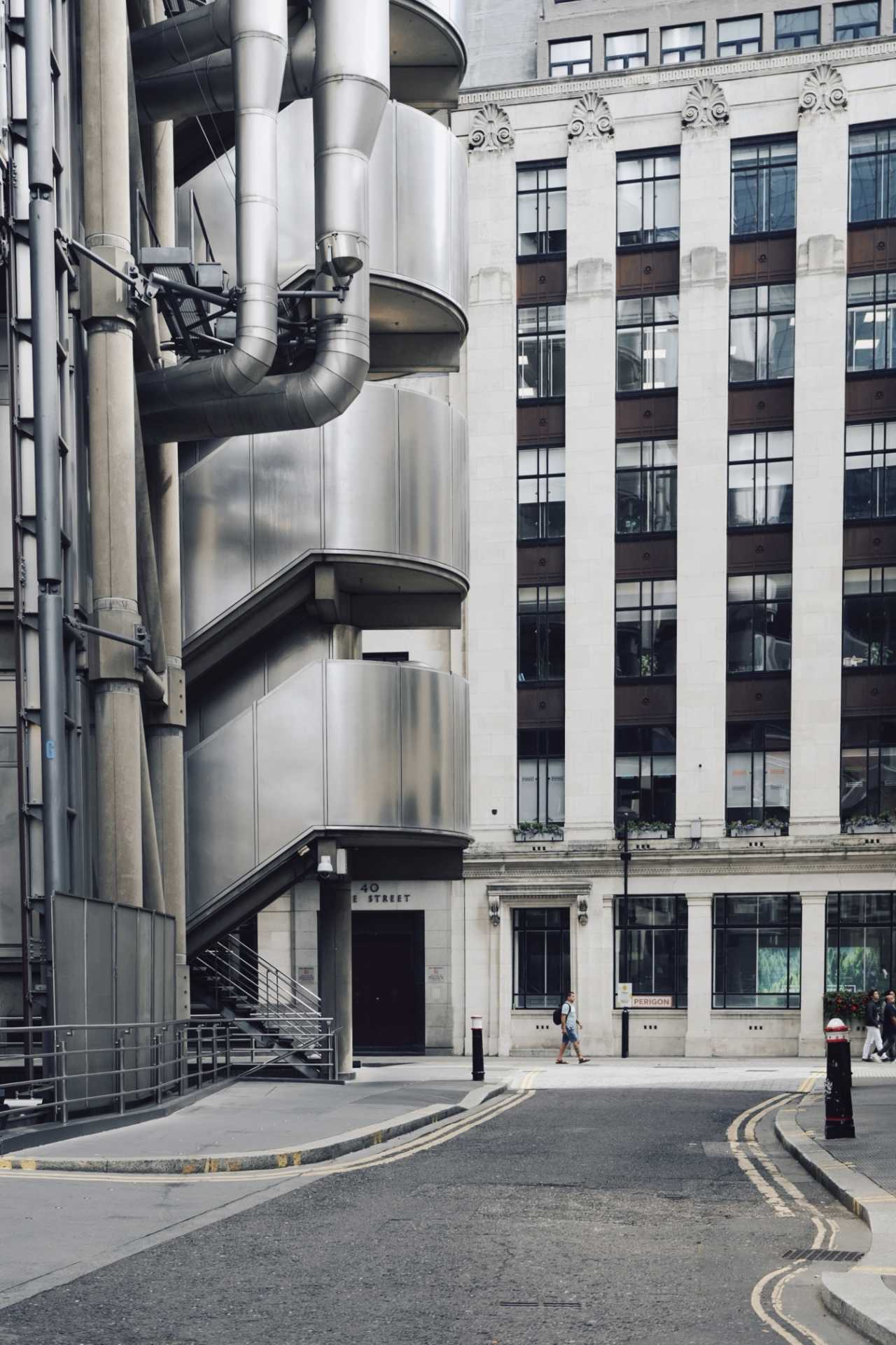 Leadenhall MarketAt one end of “Diagon Alley” stands Lloyd’s Building—a cyberpunk metal-shelled high-tech architecture masterpiece designed by Richard Rogers, completed in 1986. Its metal skin starkly contrasts surrounding traditional European buildings; this extreme functionalism is controversial, but I quite like it—there’s a surreal tension.