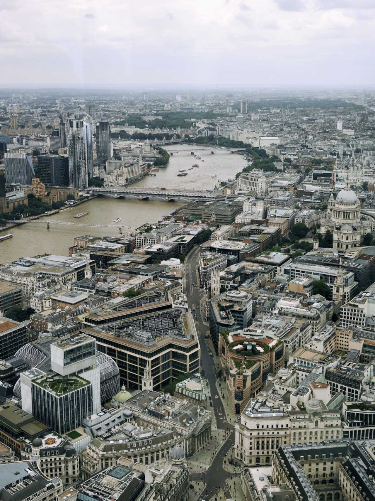 London Tower Bridge, crisscrossing streets, the gently flowing Thames, and staggered buildings are all within sight.