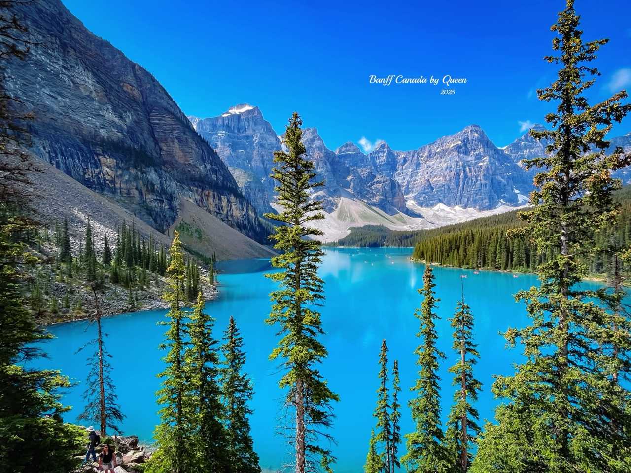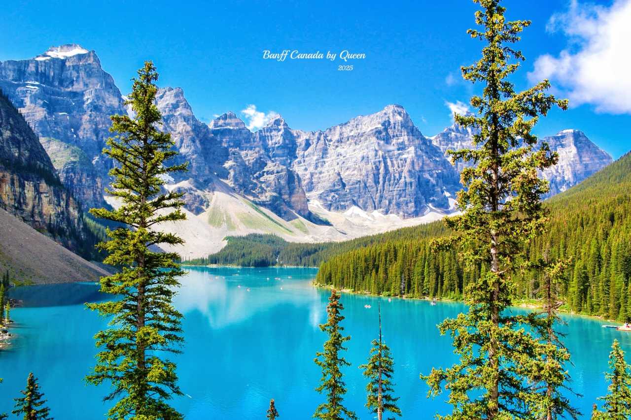 When reaching the mountaintop, that moment really takes your breath away. The lake water is unrealistically blue, that rich sapphire blue, like colors blended by snow mountains and sunlight, carrying the clarity after glacier melt, yet more transparent than any filter. The lake surface is as still as a mirror, reflecting the silhouette of Valley of the Ten Peaks, as if only mountains, water and silence remain in this world.