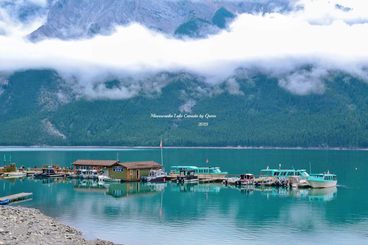 Driving along the winding mountain road, Minnewanka Lake comes into view first. She is the largest lake in Banff National Park, so vast that even the mountains seem to bow before her. Standing by the lake, the wind blows from the water surface, carrying the coolness of glaciers. The lake water is a cold tone of deep blue with gray, with shimmering waves, and distant mountains reflected in it, like a moving landscape painting.