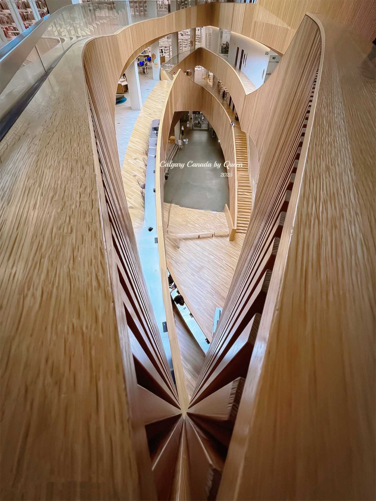 Next, I came to the Central Library. From afar, this library looks like a ship floating in the city, with honeycomb-shaped glass and light-colored wood grain exterior walls interlaced and spread out, like snowflakes, like ripples, and like a book about to be opened, extremely futuristic.