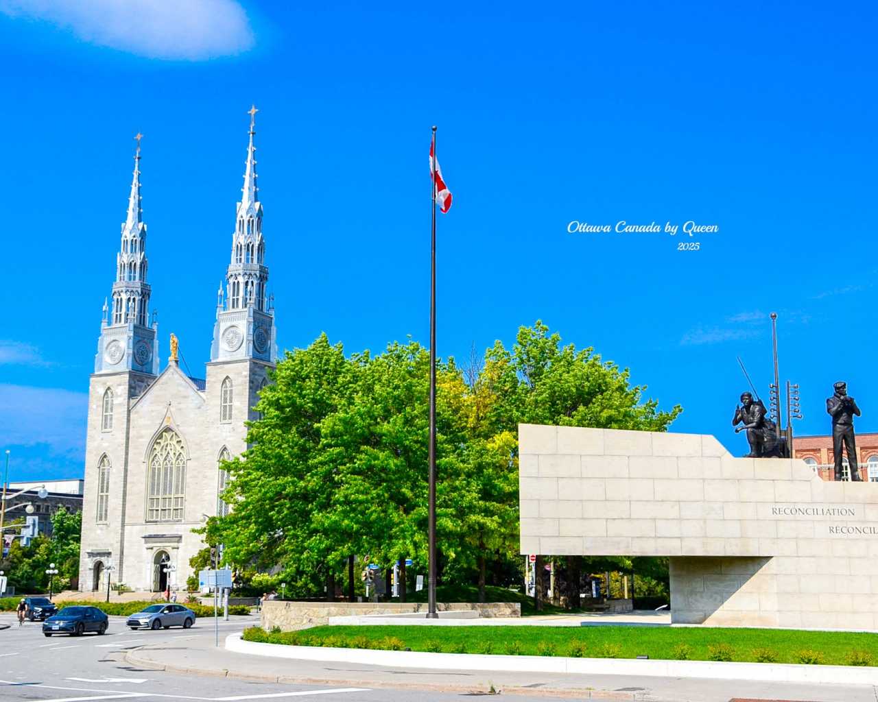 Walking across from the spider's shadow, one's gaze is involuntarily drawn to another landmark - Ottawa's oldest and most solemn church: Notre-Dame Cathedral Basilica. Her twin towers shimmer with silver light under the sun, with Gothic spires, rose windows, and blue-gold interior ceiling, exuding an almost gentle sense of sanctity.
