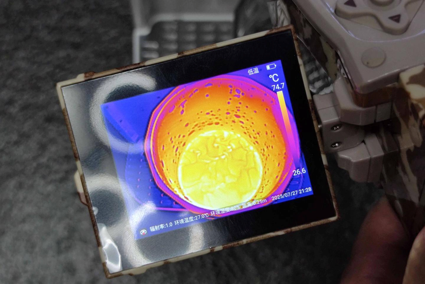 In order to be as accurate as possible, we also use a thermal imager on the equipment, which can be seen that the highest point is in the water glass, which is 74.7°C.
